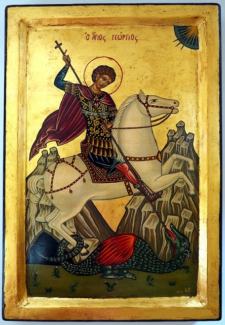 Georg wird als Ritter hoch zu Ross mit Fahne, Lanze und Schild im Kampf gegen den Drachen dargestellt. Wie in anderen ähnlichen Legenden verkörpert der Drache das Böse, das Unheimliche, das Dämonische, das durch den Glauben an Christus besiegt wird. Die Verehrung von St. Georg ist seit dem 4. Jahrhundert bezeugt. Nach der Legende stammte er aus Kappadokien und kämpfte als Legionär für den römischen Kaiser. Da er Christ war, soll er um 300 unter Diokletian (283 bis 305) den Martertod gestorben sein. Sein Grab wird in Lod, einer kleinen Stadt in Israel, vermutet. Der englische König und Kreuzritter Richard Löwenherz brachte die Georgslegende im 12. Jahrhundert nach England, wo man Georg zum Patron des Königshauses machte. Am bekanntesten ist die mittelalterliche Legende vom Drachentöter, in der vorchristliche Mythen mitschwingen: Einst bedrohte in Libyen ein furchterregender Drache die Stadt Silena. Täglich mussten ihm die Bewohner zwei Schafe opfern, um von ihm verschont zu bleiben. Als es in der Stadt keine Schafe mehr gab, verlangte der Drache täglich ein Menschenopfer. Eines Tages fiel das furchtbare Los auf die junge Tochter des Königs. Als sie zum Ufer des Sees kam, tauchte sogleich das Ungeheuer auf. Doch da erschien Georg als Rittersmann und tötete es. Nun ließen sich der König, seine Tochter und alle Einwohner von Silena taufen. Eine sehr wichtige Bauernregel, die Städter unbedingt beachten sollten: Zwischen Georgi am 23.4. und Michaeli am 29.9. sollen Wiesen nicht mehr betreten werden, da das Gras als Futter für die Tiere gebraucht wird! Was heute vergessen ist: Früher war der Georgitag auch für die städtischen Dienstboten von Bedeutung, denn weitaus häufiger als an Lichtmess wechselten sie auf Georgi ihre Stelle in adeligen oder bürgerlichen Häusern. An diesem Tag wurden auch Saisonarbeiter für den Sommer eingestellt.